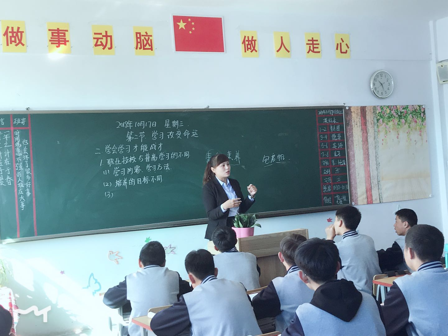 鞠艷萍老師在德育課堂上和同學(xué)探討個人素質(zhì)的提高